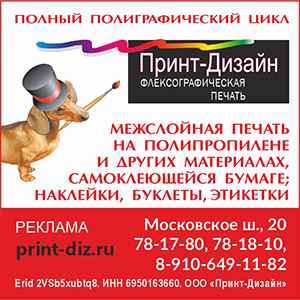 Реклама. Erid 2VSb5xubtq8. ИНН 6950163660. ООО «Принт-Дизайн»